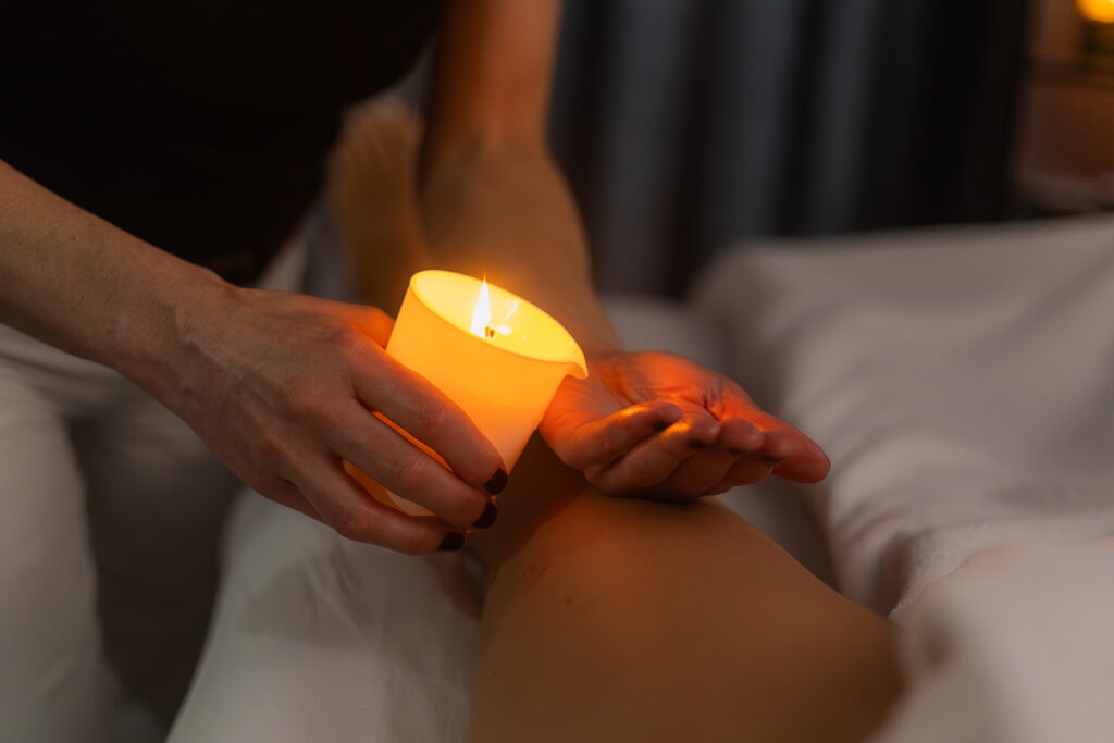 – l’utilisation consciente et sécurisée d’une bougie cosmétique chaude, intégrée naturellement au soin